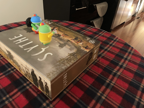 描绘了两个 Android 机器人站在一个棋盘游戏盒上,棋盘游戏盒放在一张铺有图案桌布的桌子上。 在每张包含干扰物的照片中,以不同的方式将三个小型木制机器人放在桌子上,以充当干扰物。