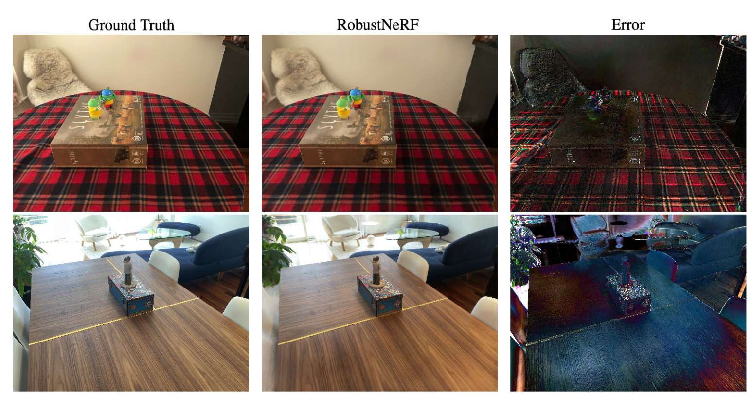 - RobustNeRF将干扰因素建模为异常值,但是其场景较简单,在复杂野外场景中性能不佳,在没有任何干扰因素的情况下也表现不佳